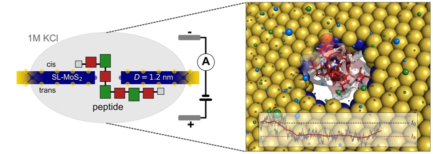 A partir des simulations de dynamique moléculaire réalisées dans ce projet, les traces de courant ionique enregistrées lors des 5 trajectoires (readout) par séquences ont été analysées. Ces traces sont disponibles en annexe (voir poster). A partir de ces traces de courant, l’objectif premier était de regarder la convergence pour déterminer si ces 5 traces étaient suffisamment cohérentes entre elles. Ce qui est le cas d’après notre étude. De plus, une transformation du signal de courant en signal « pas à pas » nous a permis d’identifier une quinzaine de niveau de courant caractéristiques (entre 10 et 17 selon les séquences) et plus d’une centaine d’exploration de ces niveaux par trajectoires. Sachant que la protéine alpha-Synucléine comprend 17 acides aminés différents dans sa composition pour un total de 140 acides aminés, nous pouvons à partir de ces résultats conclure que le capteur nanopore de type MoS2 est capable de séquencer la protéine (quasi) acide aminé par acide aminé avec une précision de lecture remarquable.