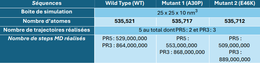 L’objectif initial du projet, grâce aux moyens mis à disposition lors du MésoBFC – Défi CPU 2023 était la simulation de la détection complète du biomarqueur par le capteur. En effet, par le passé, seule la détection de « morceaux » de cette protéine alpha-Synucléine avait été réalisée (Nicolaï et al. Nanoscale 2020, 12, 22743-22753). De par la taille du système à modéliser puis simuler, le nombre de cœurs nécessaires est très important et les temps de simulations pour observer le passage complet de la protéine le sont également. Ce type de simulation de dynamique moléculaire « tous atomes » est donc un exploit en soit et n’a jamais été réalisée à notre connaissance sur une si longue protéine.